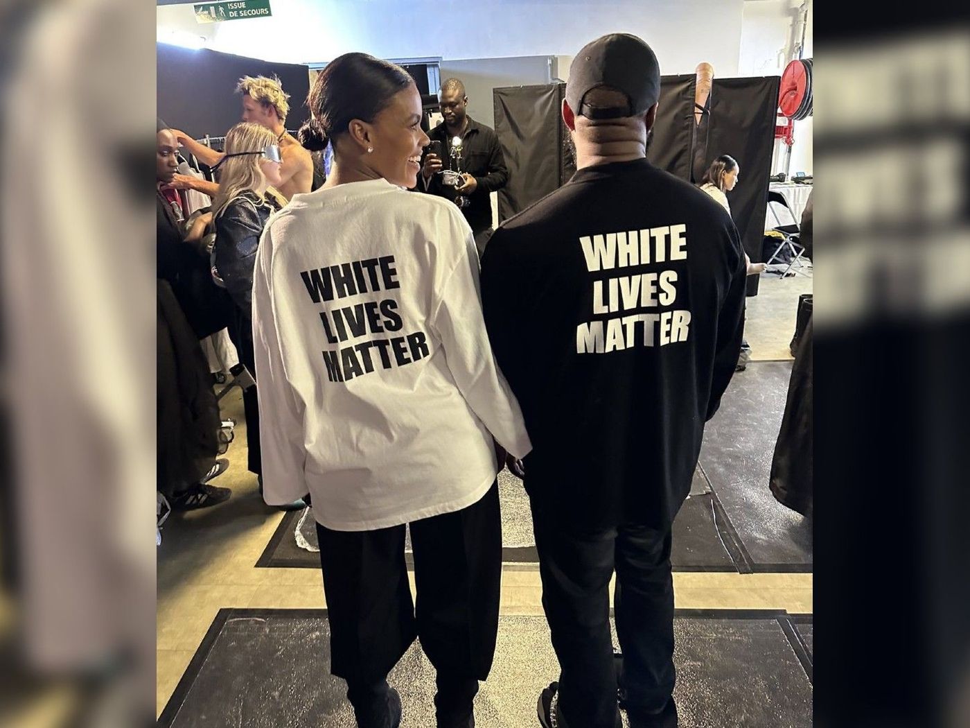 Primero, Kanye apareció en la Semana de la Moda de París vistiendo una camiseta que decía "White lives matter" (Las vidas blancas importan). Este eslogan fue adoptado por opositores del movimiento "Black lives matter", que aboga por la igualdad de derechos para todas las razas. Él llevaba la versión negra de la camiseta, mientras que su acompañante, la activista negra Candace Owens, llevaba una blanca con el mismo mensaje.