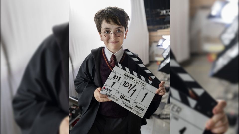 Dominic aparece con el uniforme escolar (presumiblemente de Gryffindor): capa, chaleco, corbata roja, todo según el canon. Sostiene una claqueta fechada el 14 de julio que dice "episodio 101, escena 1", y bajo su cabello oscuro, sobre las gafas redondas, se puede ver la famosa cicatriz.